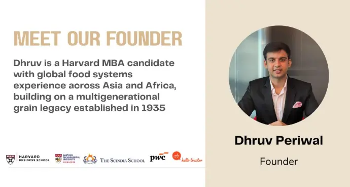 Our founder, Dhruv is a Harvard MBA candidate. With the support of his family, he brings together his global food systems experience across Asia and Africa with a multigenerational grain legacy dating back to 1935. What began in our family kitchen in Jaipur has grown into a heartfelt promise - to bring back the purity, freshness, and goodness of real food.