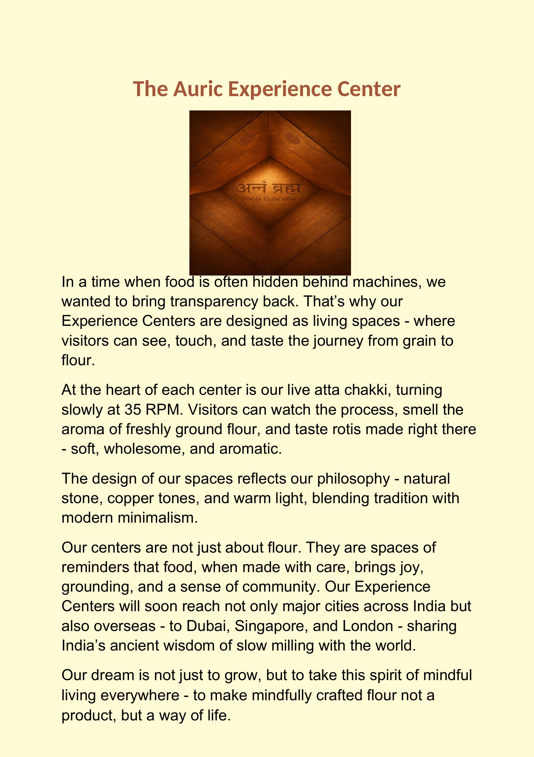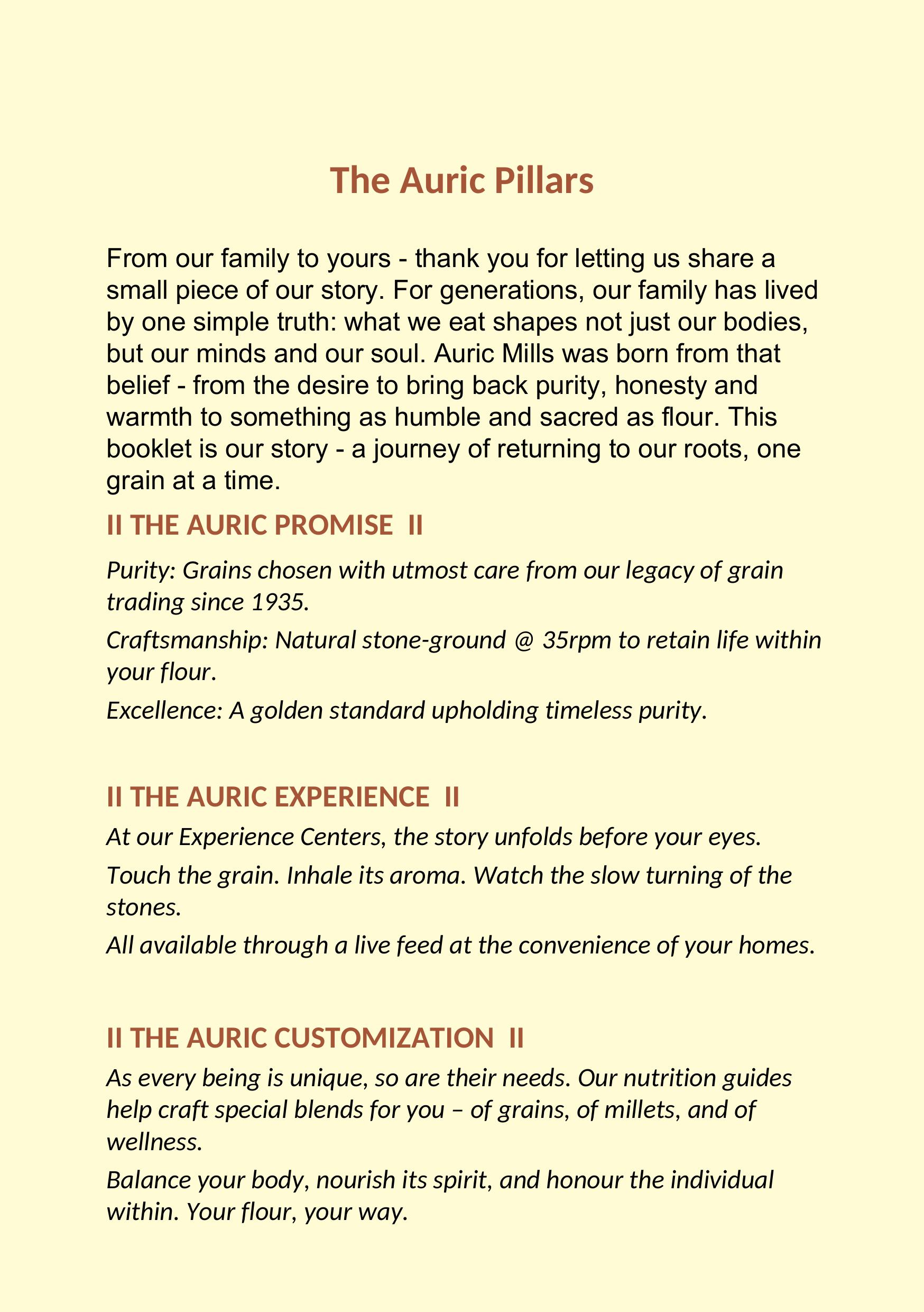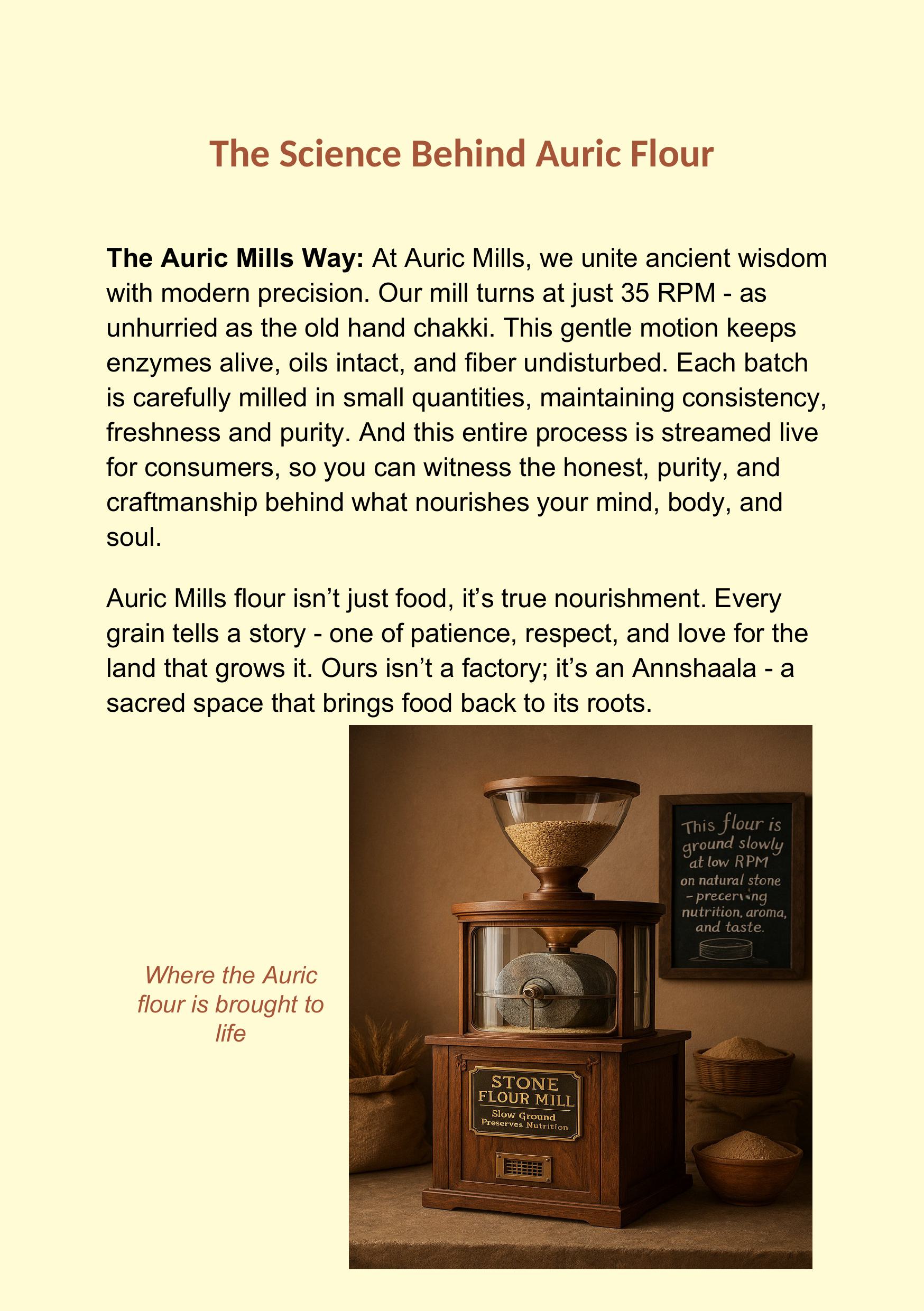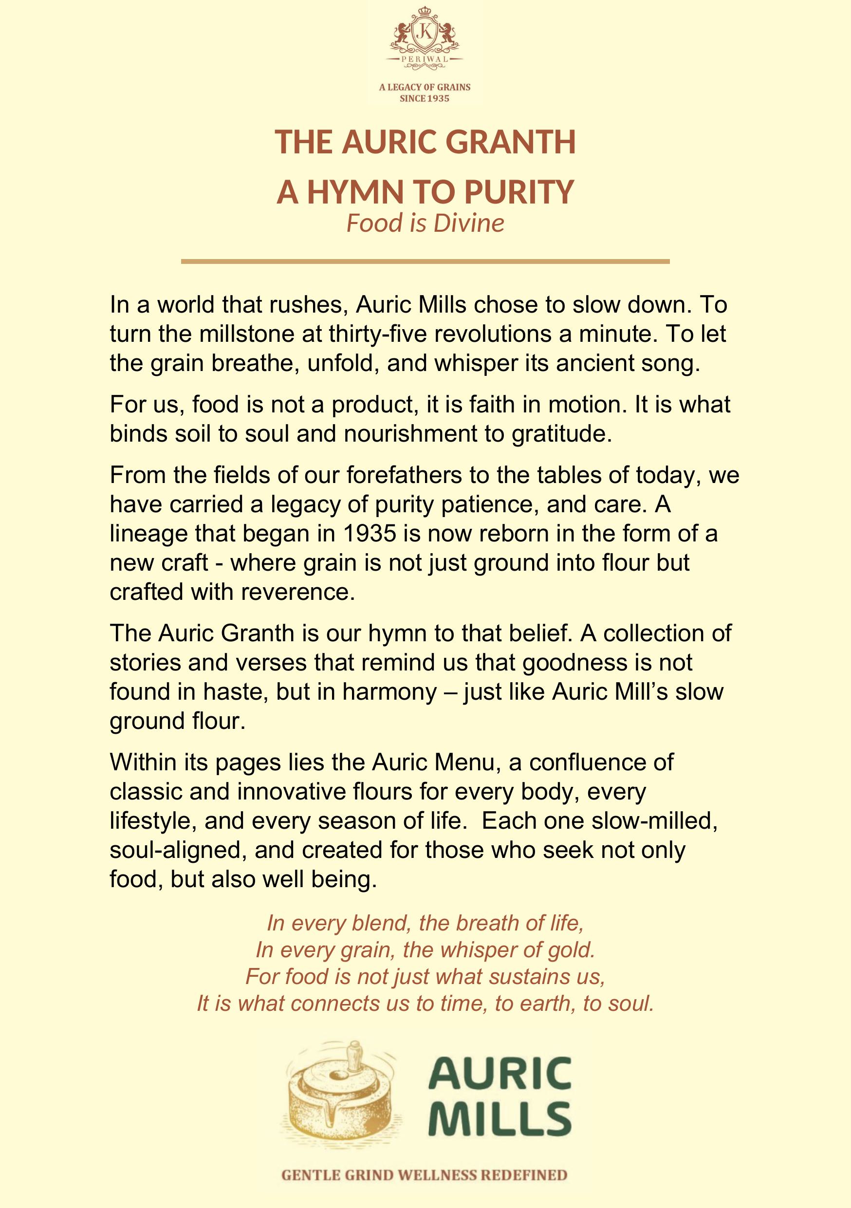 Auric Granth is a beautiful story about purity, tradition, and the deep respect Auric Mills has for food. It explains how the brand revives the old way of milling flour—slow, careful, and full of life. In today’s fast world, most flour loses its nutrients due to high-speed machines, but Auric Mills chooses patience. Their natural stone mills turn at just 45 RPM, keeping the grain cool and alive. The Granth describes how every grain is traced from the farm to your plate, ensuring honesty and trust. It highlights the importance of nourishing the body, mind, and soul with real, wholesome food. The Experience Centers allow people to see the process live, touch the grains, smell the fresh flour, and feel connected to what they eat. The book also explains their menu of classic, wellness, and customizable flours for different needs. Overall, the Auric Granth is a gentle reminder that food made with care brings health, happiness, and a sense of belonging. It celebrates slow milling, clean ingredients, and the belief that flour is not just food—it is a part of our heritage and our well-being.