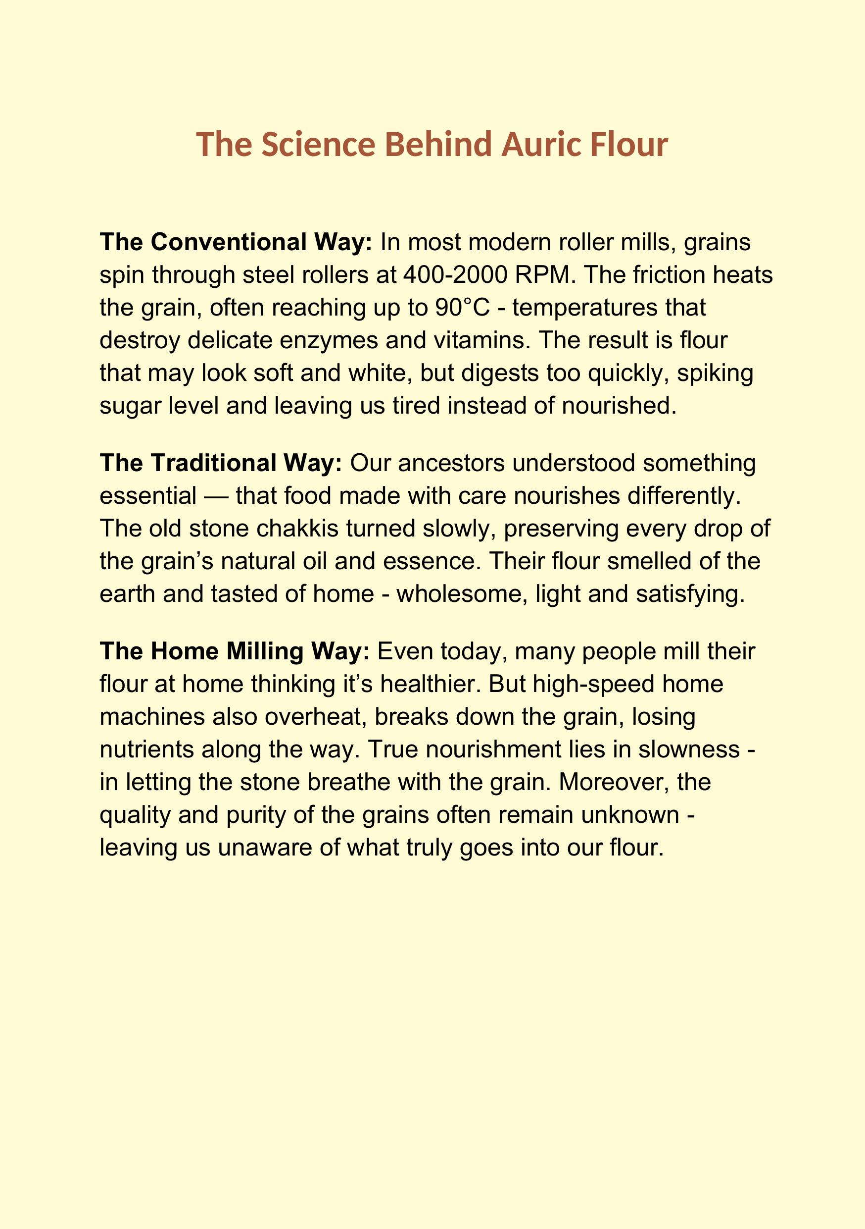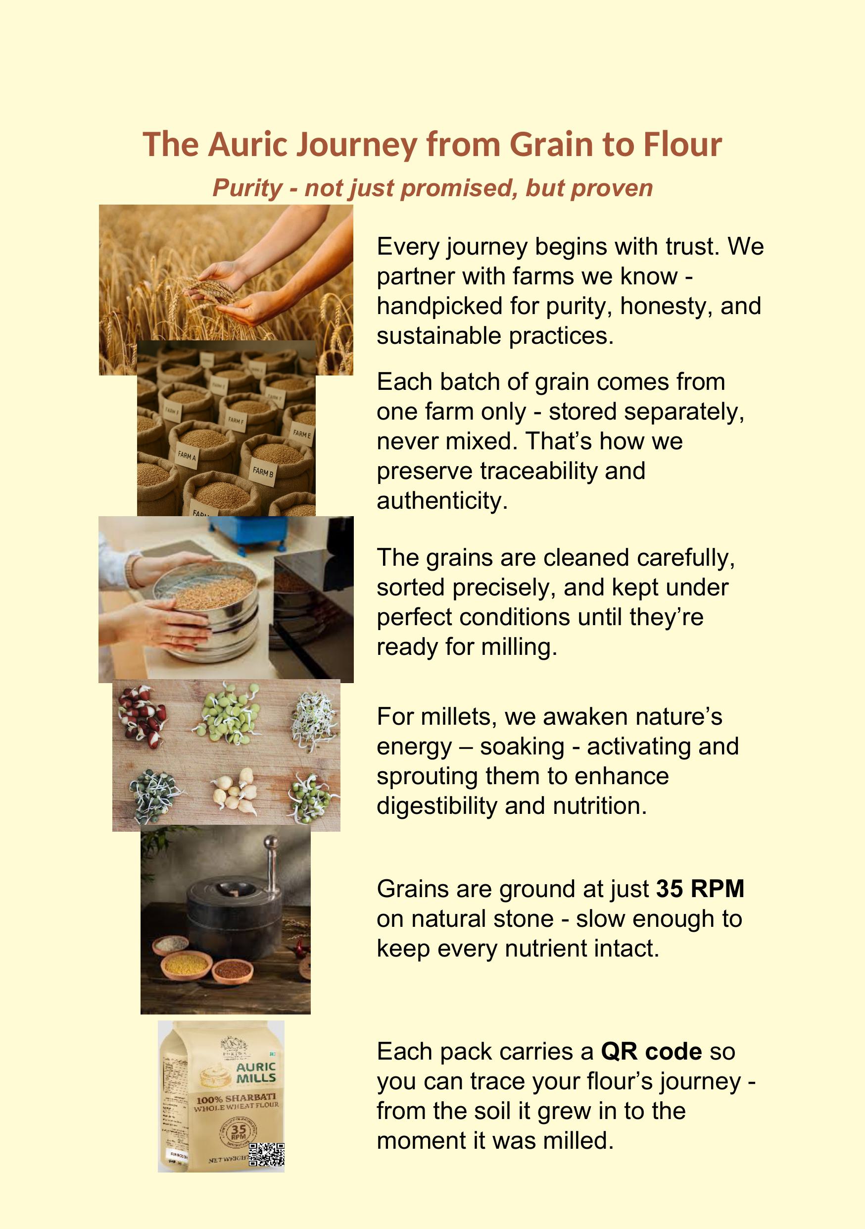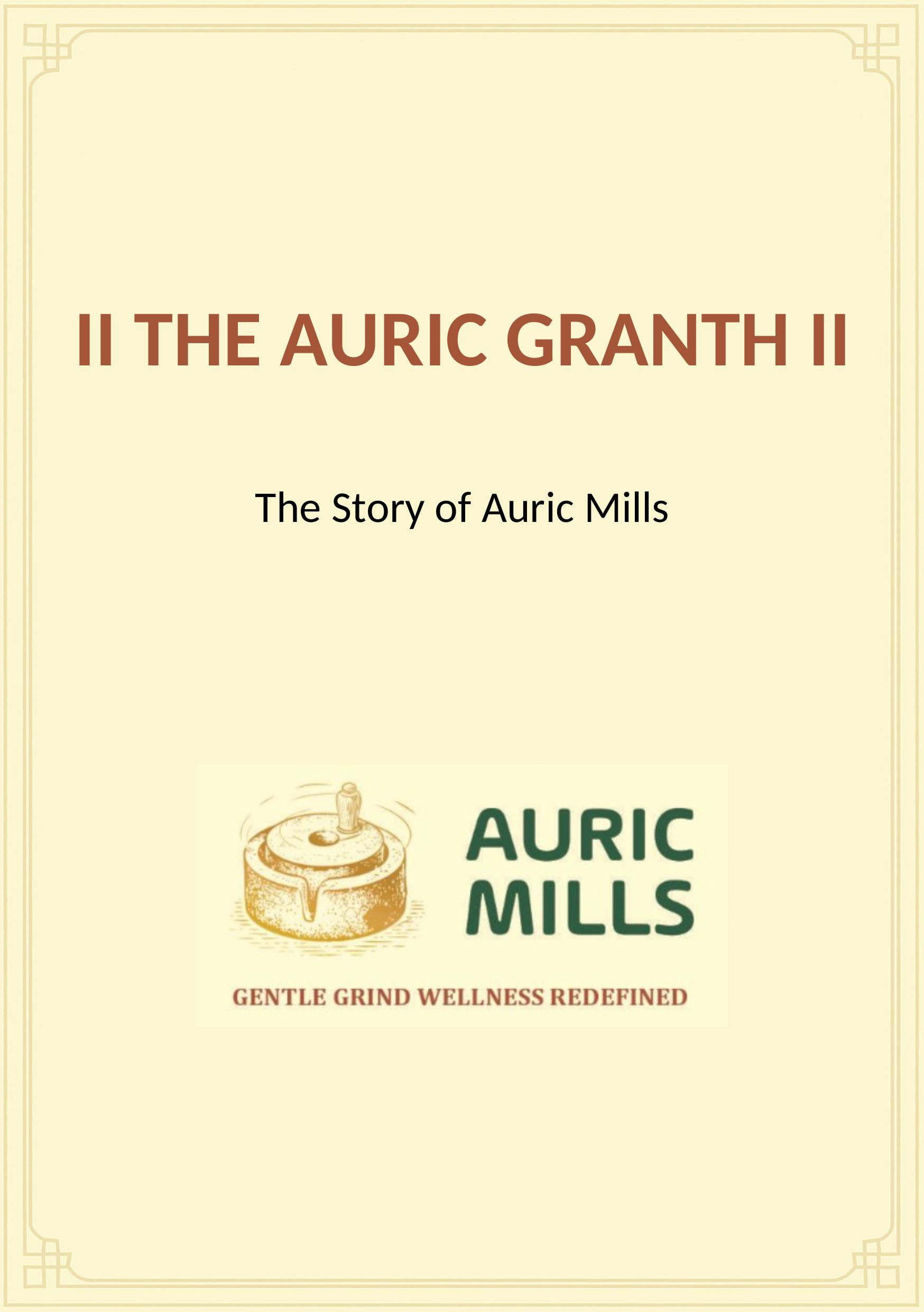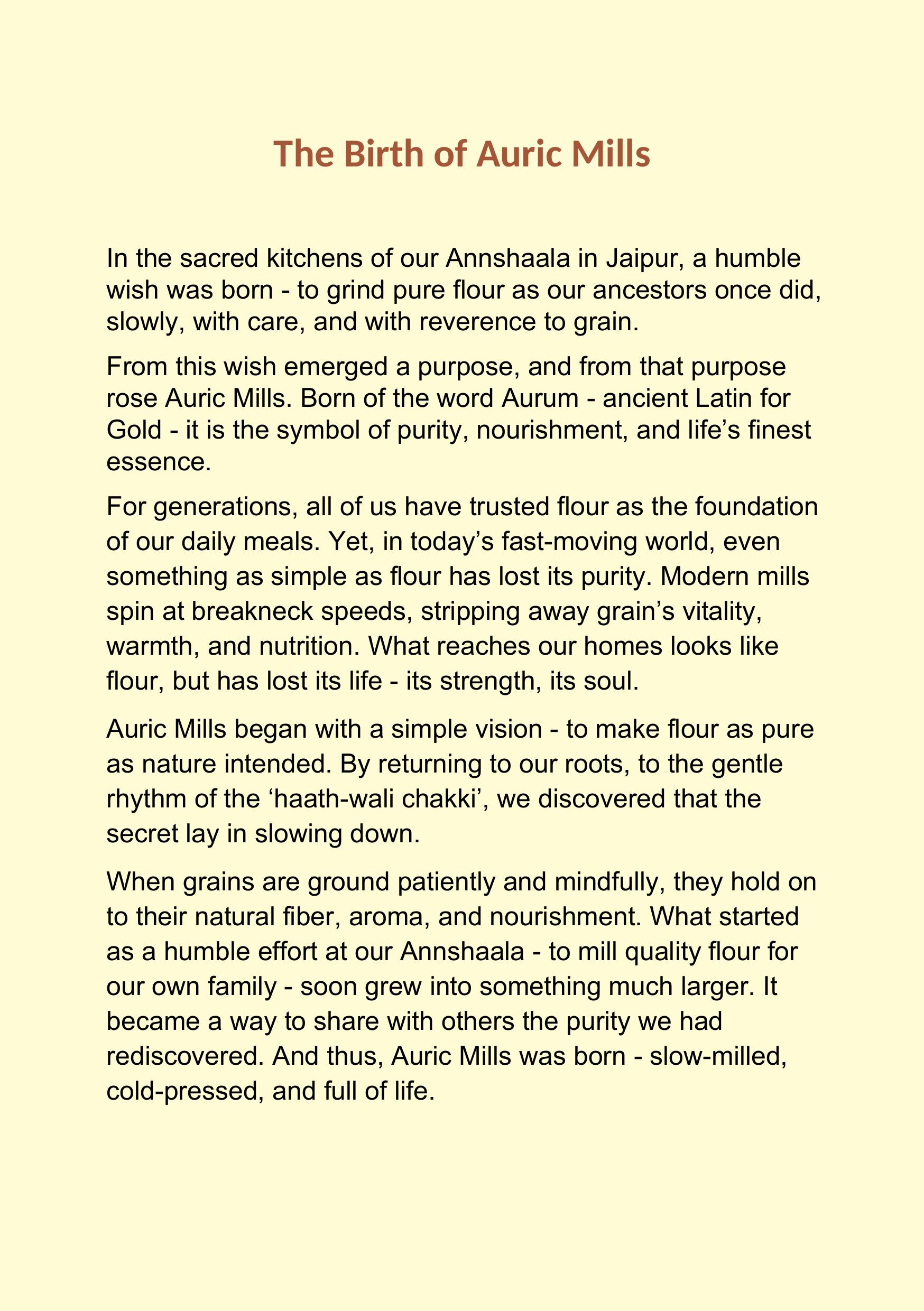 Auric Granth is a beautiful story about purity, tradition, and the deep respect Auric Mills has for food. It explains how the brand revives the old way of milling flour—slow, careful, and full of life. In today’s fast world, most flour loses its nutrients due to high-speed machines, but Auric Mills chooses patience. Their natural stone mills turn at just 45 RPM, keeping the grain cool and alive. The Granth describes how every grain is traced from the farm to your plate, ensuring honesty and trust. It highlights the importance of nourishing the body, mind, and soul with real, wholesome food. The Experience Centers allow people to see the process live, touch the grains, smell the fresh flour, and feel connected to what they eat. The book also explains their menu of classic, wellness, and customizable flours for different needs. Overall, the Auric Granth is a gentle reminder that food made with care brings health, happiness, and a sense of belonging. It celebrates slow milling, clean ingredients, and the belief that flour is not just food—it is a part of our heritage and our well-being.