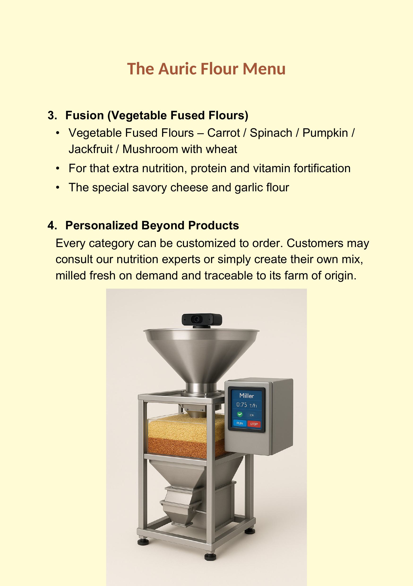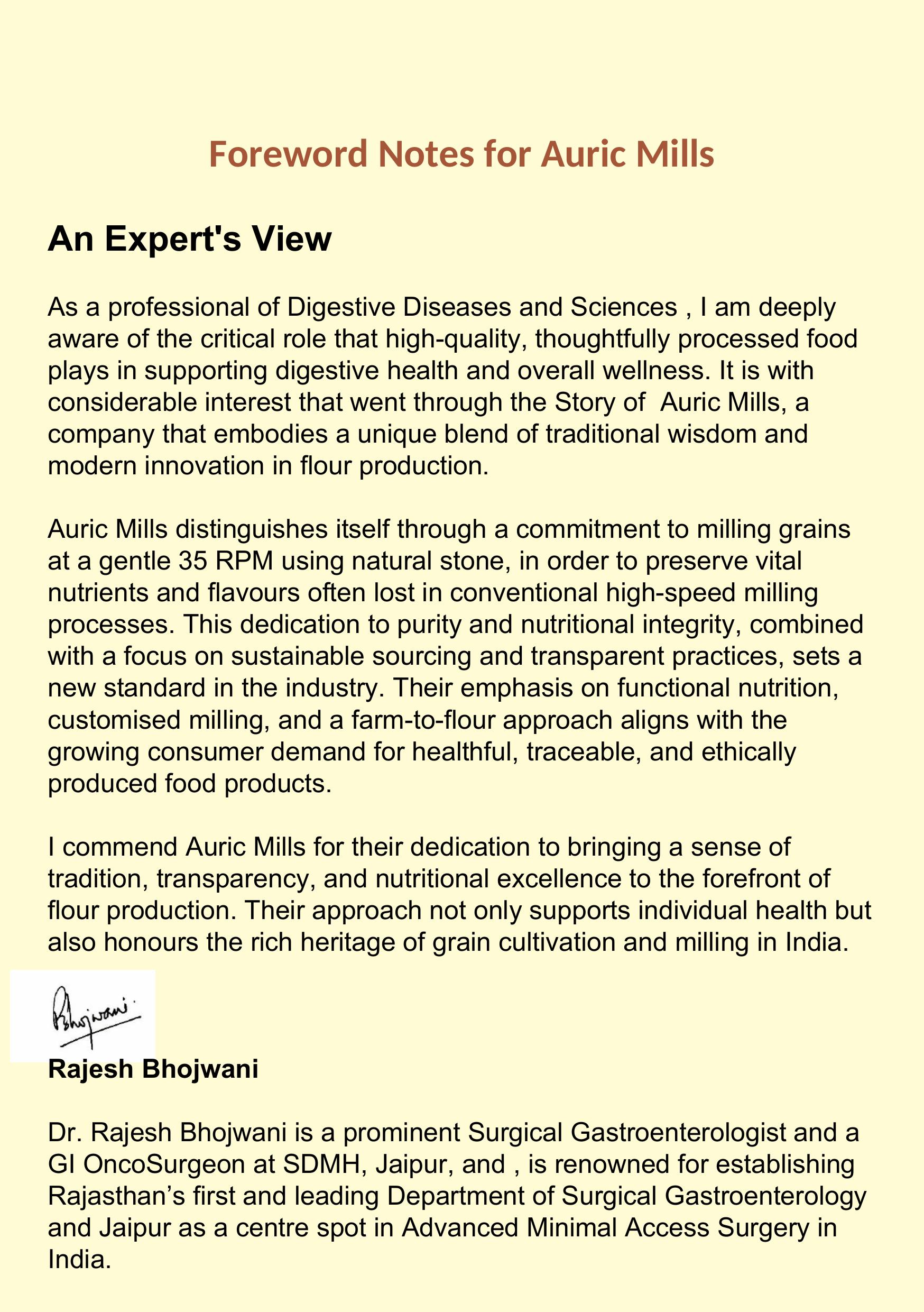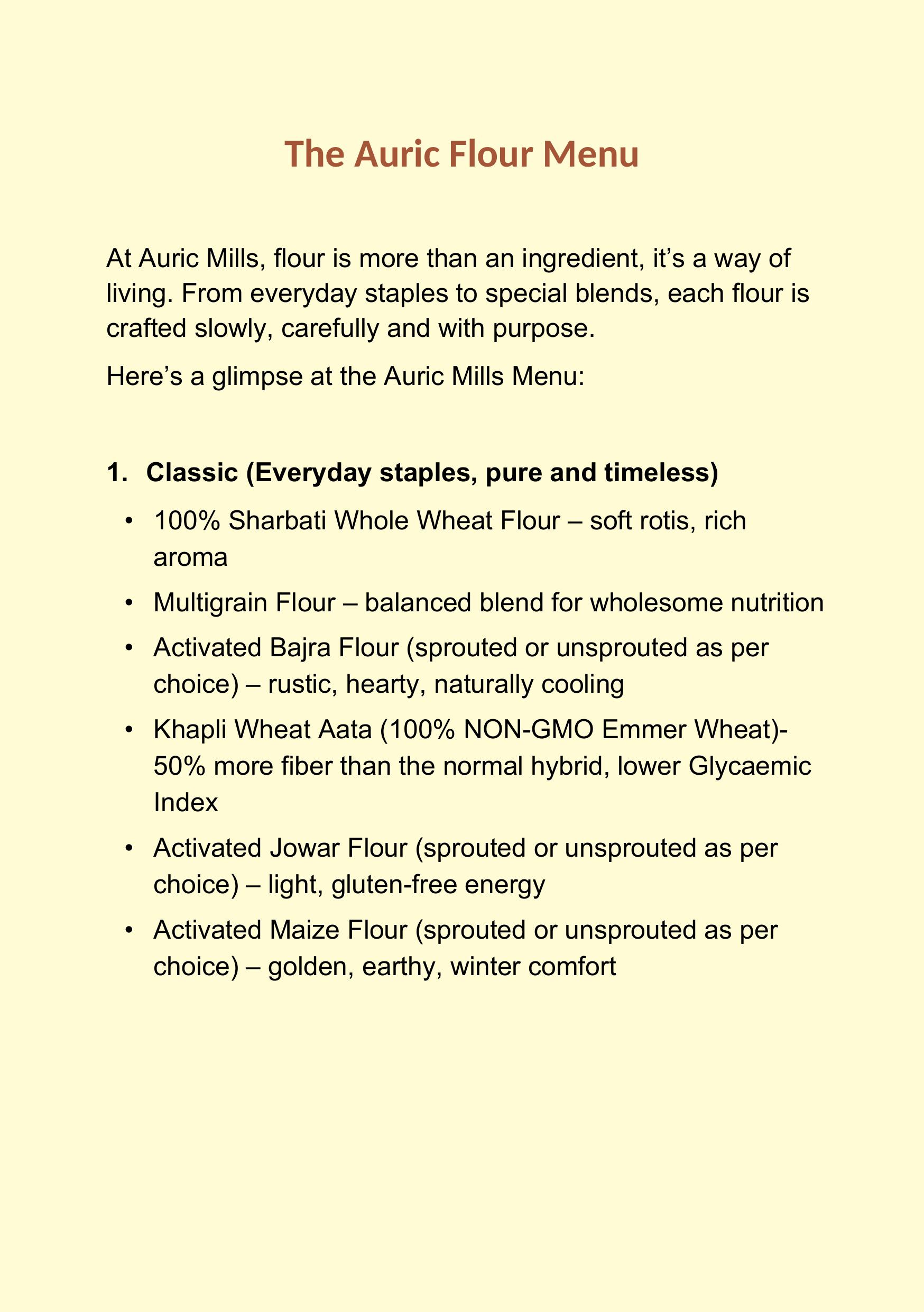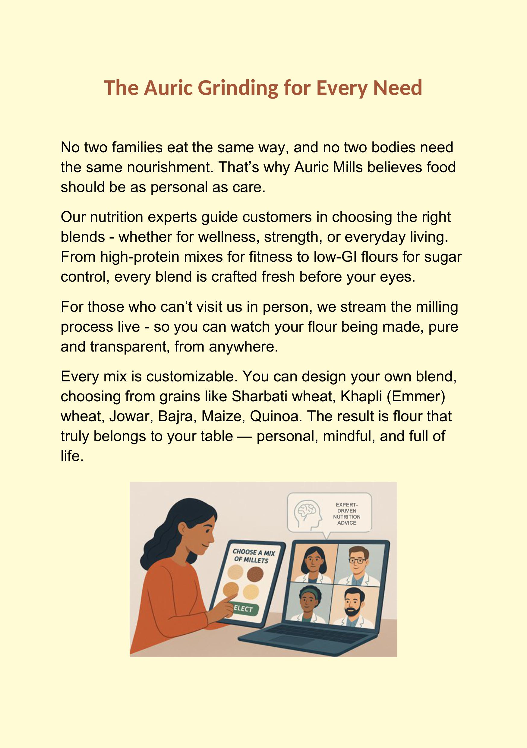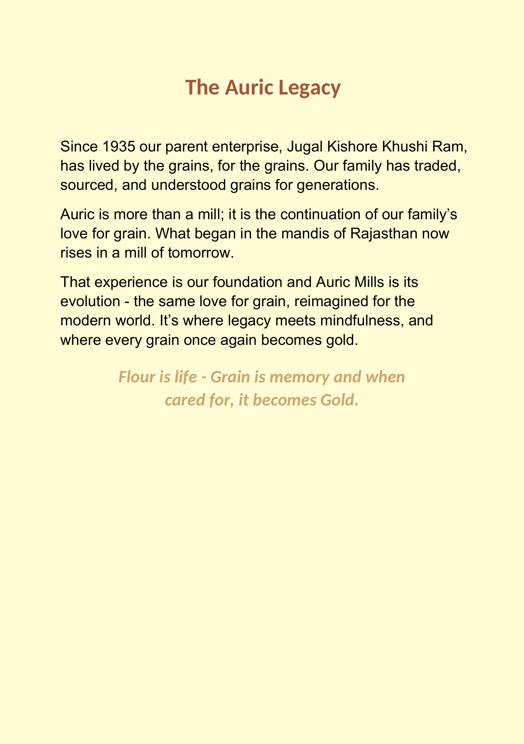 Auric Granth is a beautiful story about purity, tradition, and the deep respect Auric Mills has for food. It explains how the brand revives the old way of milling flour—slow, careful, and full of life. In today’s fast world, most flour loses its nutrients due to high-speed machines, but Auric Mills chooses patience. Their natural stone mills turn at just 45 RPM, keeping the grain cool and alive. The Granth describes how every grain is traced from the farm to your plate, ensuring honesty and trust. It highlights the importance of nourishing the body, mind, and soul with real, wholesome food. The Experience Centers allow people to see the process live, touch the grains, smell the fresh flour, and feel connected to what they eat. The book also explains their menu of classic, wellness, and customizable flours for different needs. Overall, the Auric Granth is a gentle reminder that food made with care brings health, happiness, and a sense of belonging. It celebrates slow milling, clean ingredients, and the belief that flour is not just food—it is a part of our heritage and our well-being.