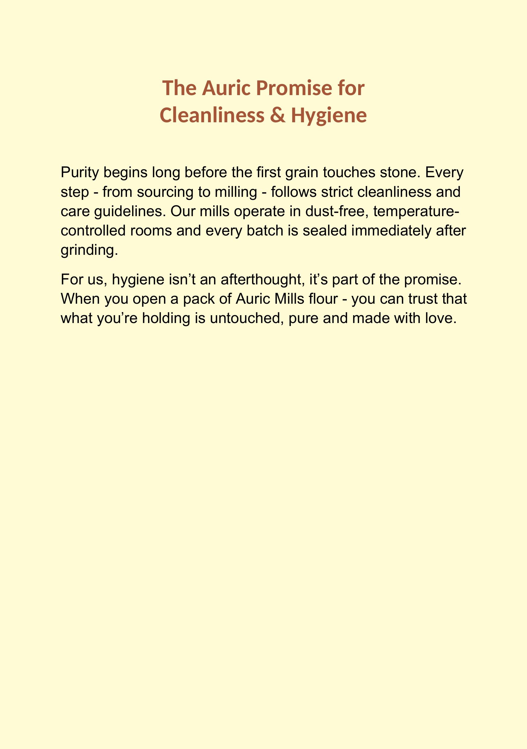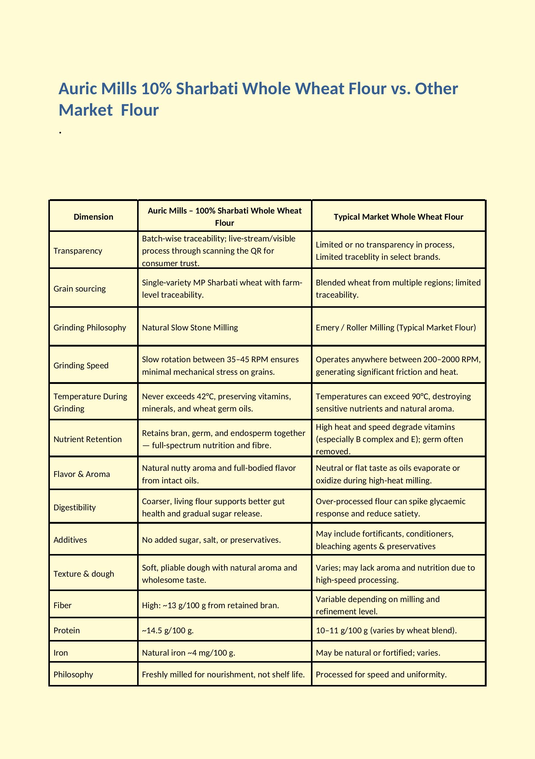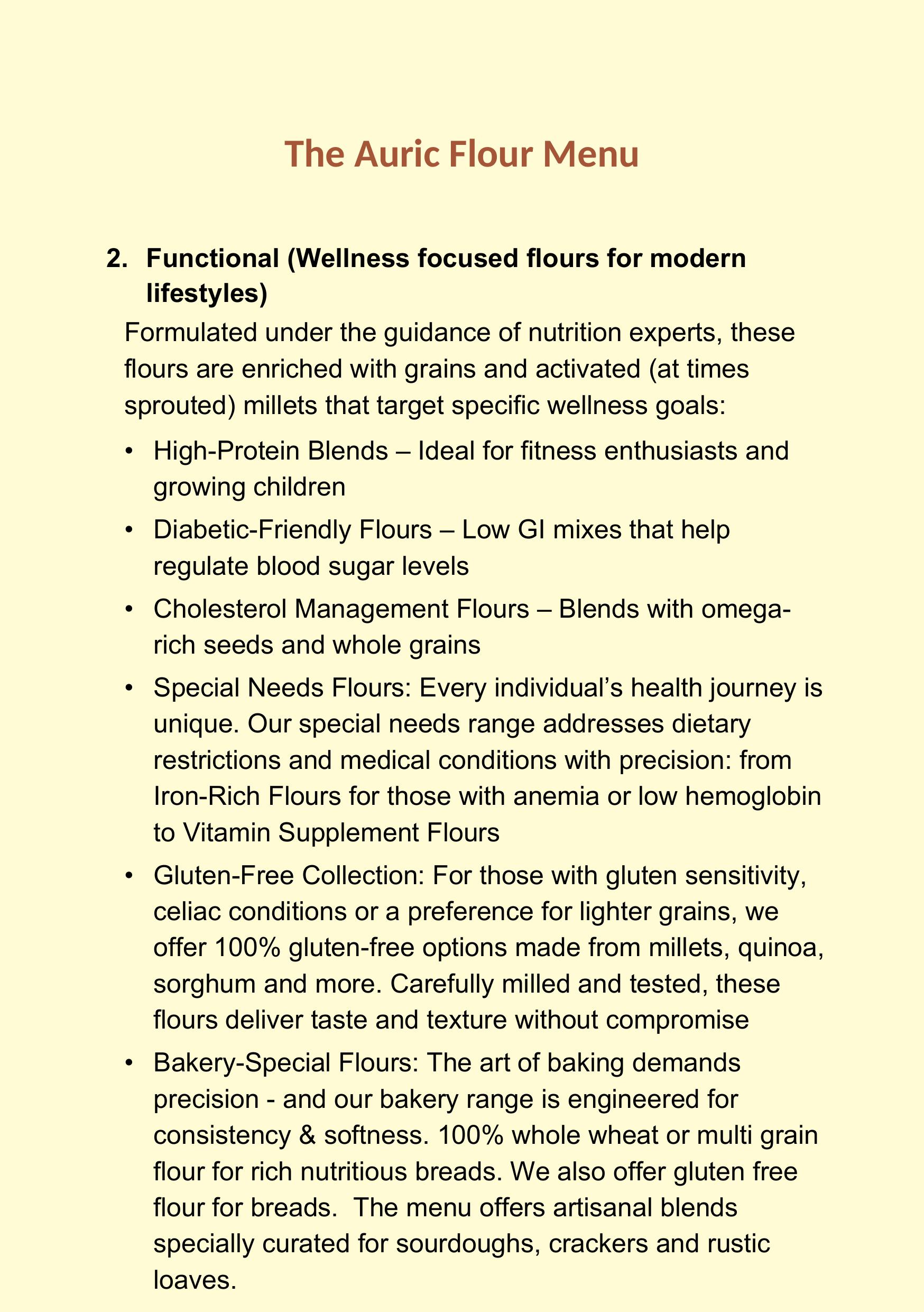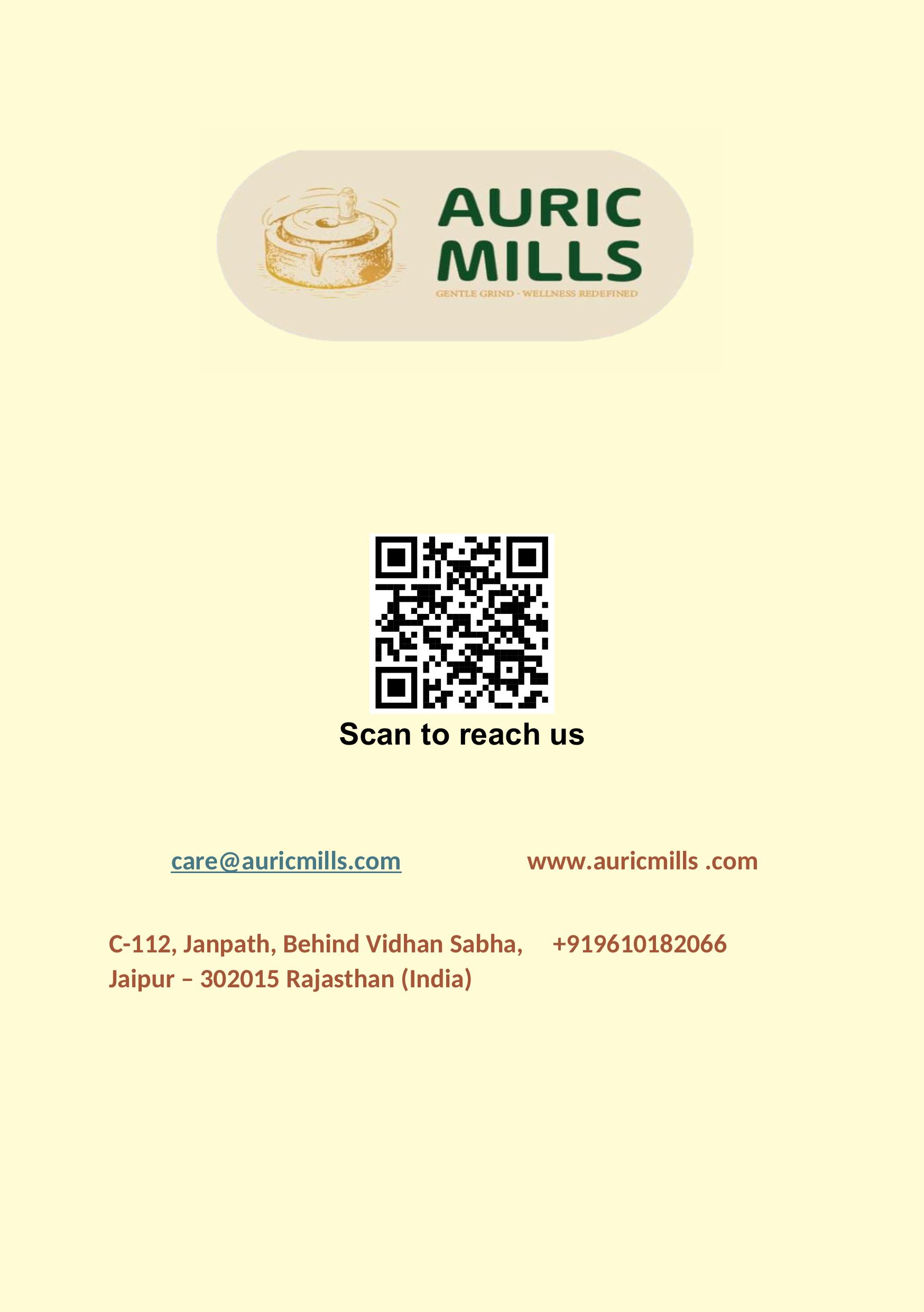 Auric Granth is a beautiful story about purity, tradition, and the deep respect Auric Mills has for food. It explains how the brand revives the old way of milling flour—slow, careful, and full of life. In today’s fast world, most flour loses its nutrients due to high-speed machines, but Auric Mills chooses patience. Their natural stone mills turn at just 45 RPM, keeping the grain cool and alive. The Granth describes how every grain is traced from the farm to your plate, ensuring honesty and trust. It highlights the importance of nourishing the body, mind, and soul with real, wholesome food. The Experience Centers allow people to see the process live, touch the grains, smell the fresh flour, and feel connected to what they eat. The book also explains their menu of classic, wellness, and customizable flours for different needs. Overall, the Auric Granth is a gentle reminder that food made with care brings health, happiness, and a sense of belonging. It celebrates slow milling, clean ingredients, and the belief that flour is not just food—it is a part of our heritage and our well-being.
