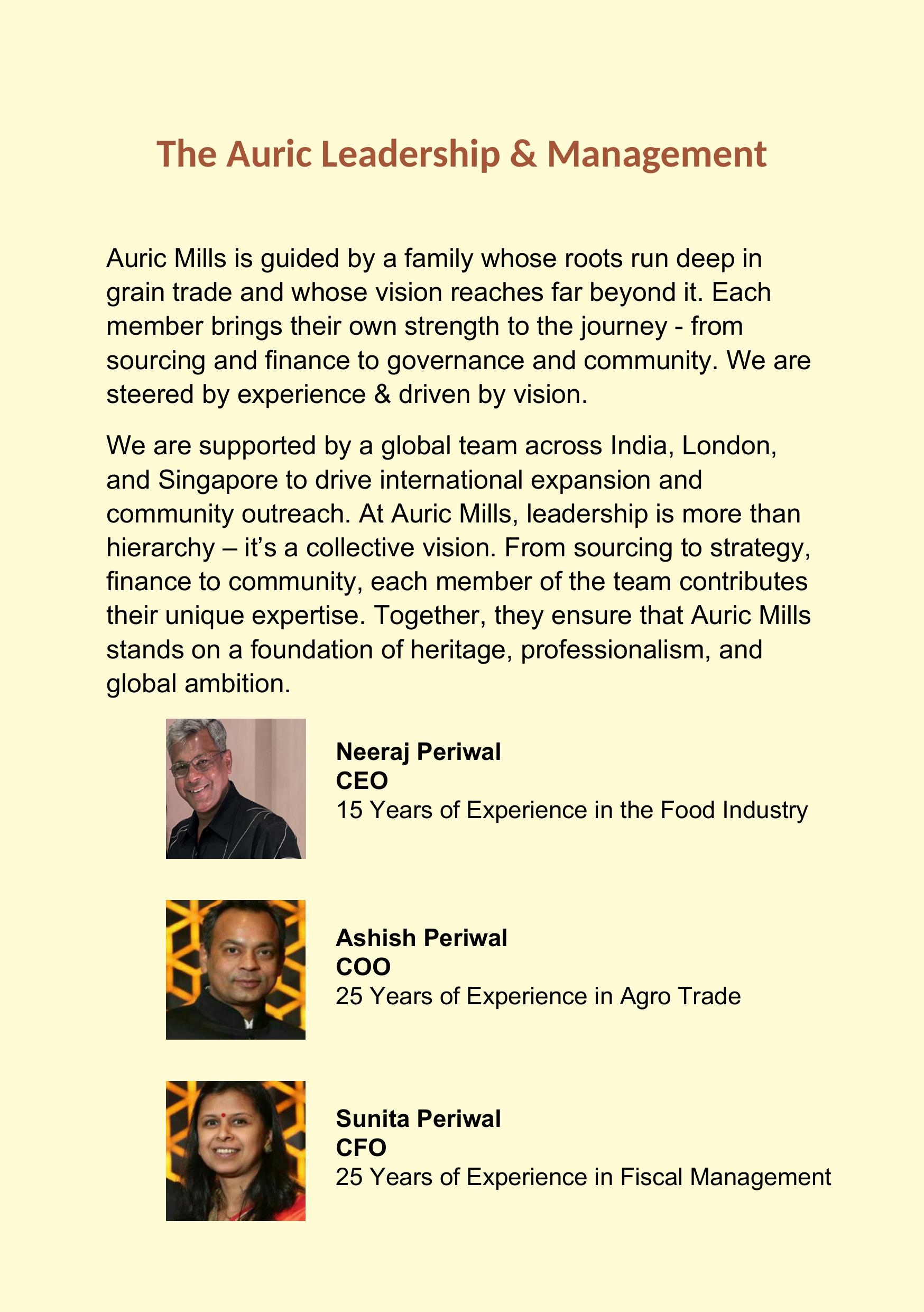 Neeraj Periwal serves as the CEO of Auric Mills and brings 15 years of experience in the food industry. His leadership reflects a deep understanding of how food, when crafted with honesty and purity, can improve people’s lives. With a family legacy that has worked with grains since 1935, Neeraj carries forward this heritage while giving it a modern, global direction.